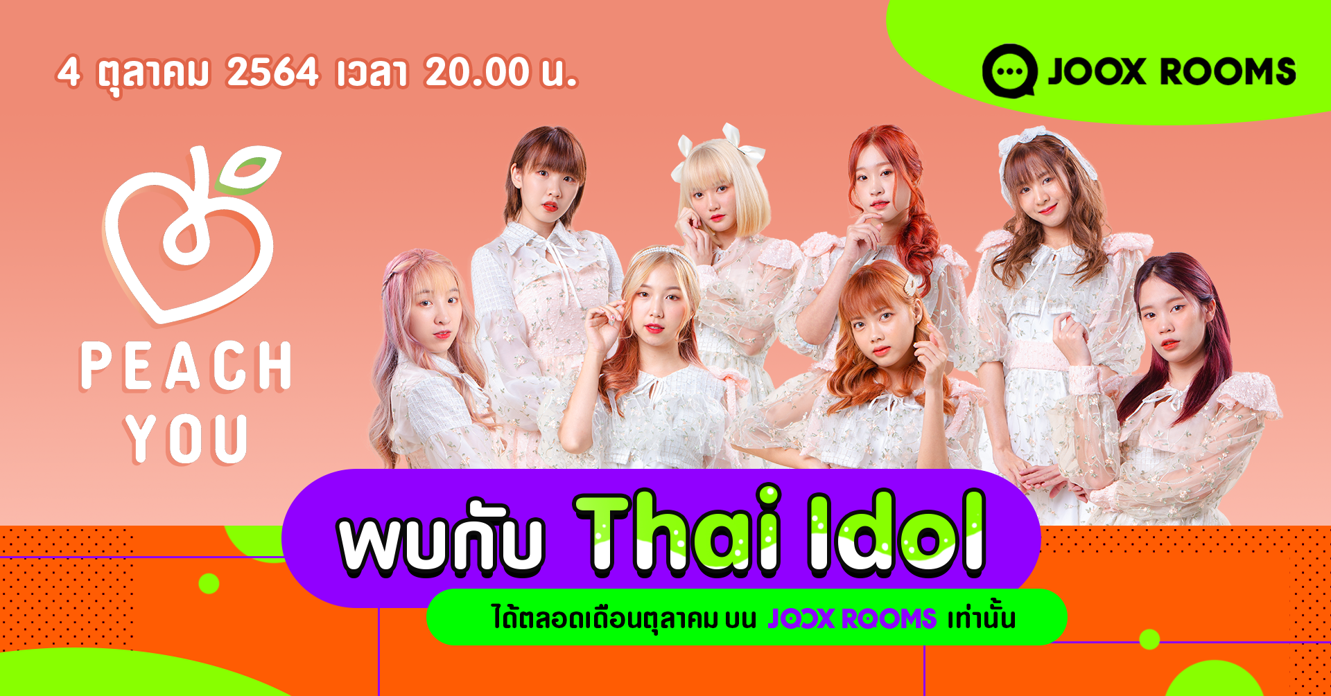 ออกสตาร์ทไปกับวง “Peach You” วงไอดอลสุดน่ารักจากค่าย GENERATION CUTE ที่เคยฝากผลงานความสนุกไปแล้วในรายการ LODI X NEXT IDOL และในครั้งนี้เราจะได้พบกับ กะตางค์-พรรณพฤกษา มานิตย์ , แอมโกะ-วรินทร ชยุตาพงศ์, เอิงเอย-ชนิสรา เจียรไกรเดช , มิ้นท์-ณัฐณิชา จันทร์สามสี, มิยู ทากูจิ, จินจิน-ศรสิริ คงตะกูลเทียน, มายด์-ชนิตา อินอรัญ และ แอนจี้-บุณยานุช ชัยพรแก้ว มาสร้างความสนุกให้ทุกคนอีกครั้งในวันจันทร์ที่ 4 ตุลาคม เวลา 20.00 ที่ JOOX ROOMS บอกเลยว่าแฟนคลับ Peach you ห้ามพลาดเด็ดขาด Exclusive ขนาดนี้