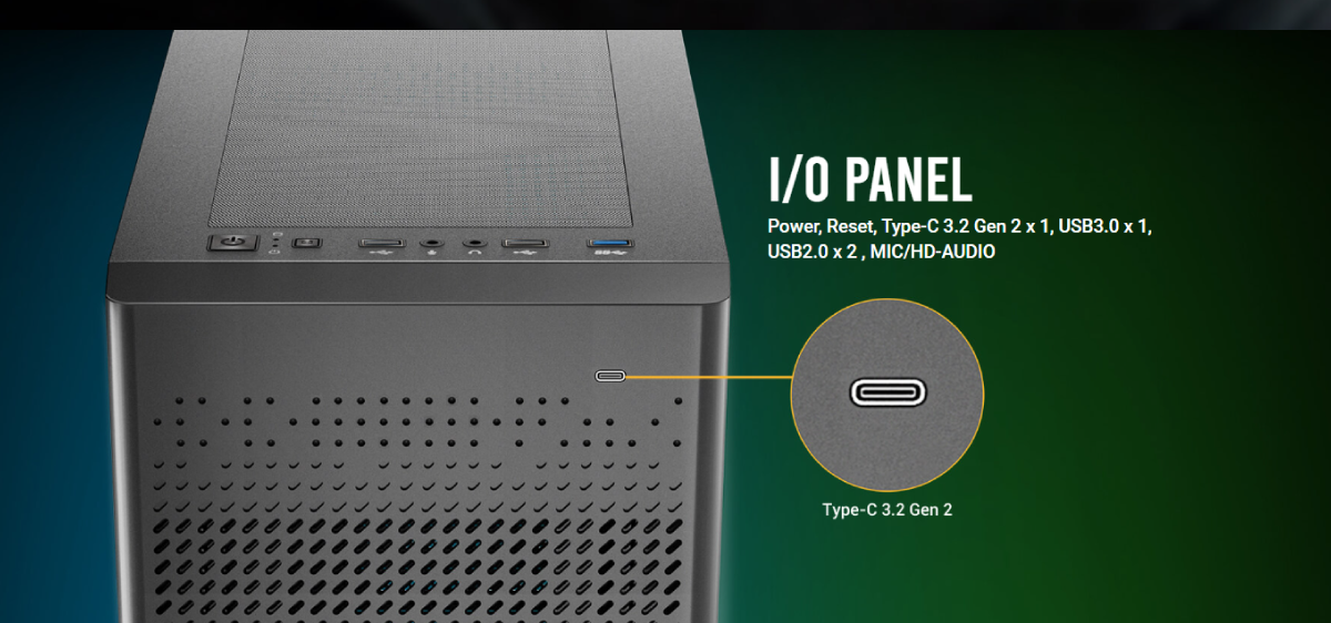 แผงปุ่มด้านบนประกอบด้วย ปุ่ม Power ,ปุ่ม Reset ,Type–C 3.2 Gen 2 สำหรับการถ่ายโอนความเร็วสูง USB 2.0 2 ช่อง , USB 3.0 และ MIC/HD-AUDIO