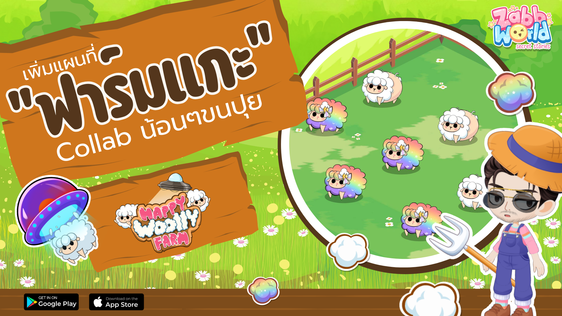 Zabb World จับมือกับ Happy Woolly Farm เพิ่มแผนที่ ”ฟาร์มแกะ” เข้ามาภายในแผนที่จะมีน้องๆแกะขนปุยนุ่มรอให้ผู้เล่นเข้าไปเก็บสะสมนำไปแลกเป็นชุดเซ็ต “แฮปปี้เด็กเลี้ยงแกะ” (เหมือนตัวเองได้เป็นชาวนาอย่างแท้จริง) โดยจะเปิดในช่วงชิงในช่วงระยะเวลาจำกัด งานนี้ขอท้านิ้วปลาหมึกของผู้เล่นเพื่อช่วงชิงนำมาสร้างชุดแฟชั่นสุดแรร์ที่จะมีเพียงผู้ที่มือไวที่สุดเท่านั้น!