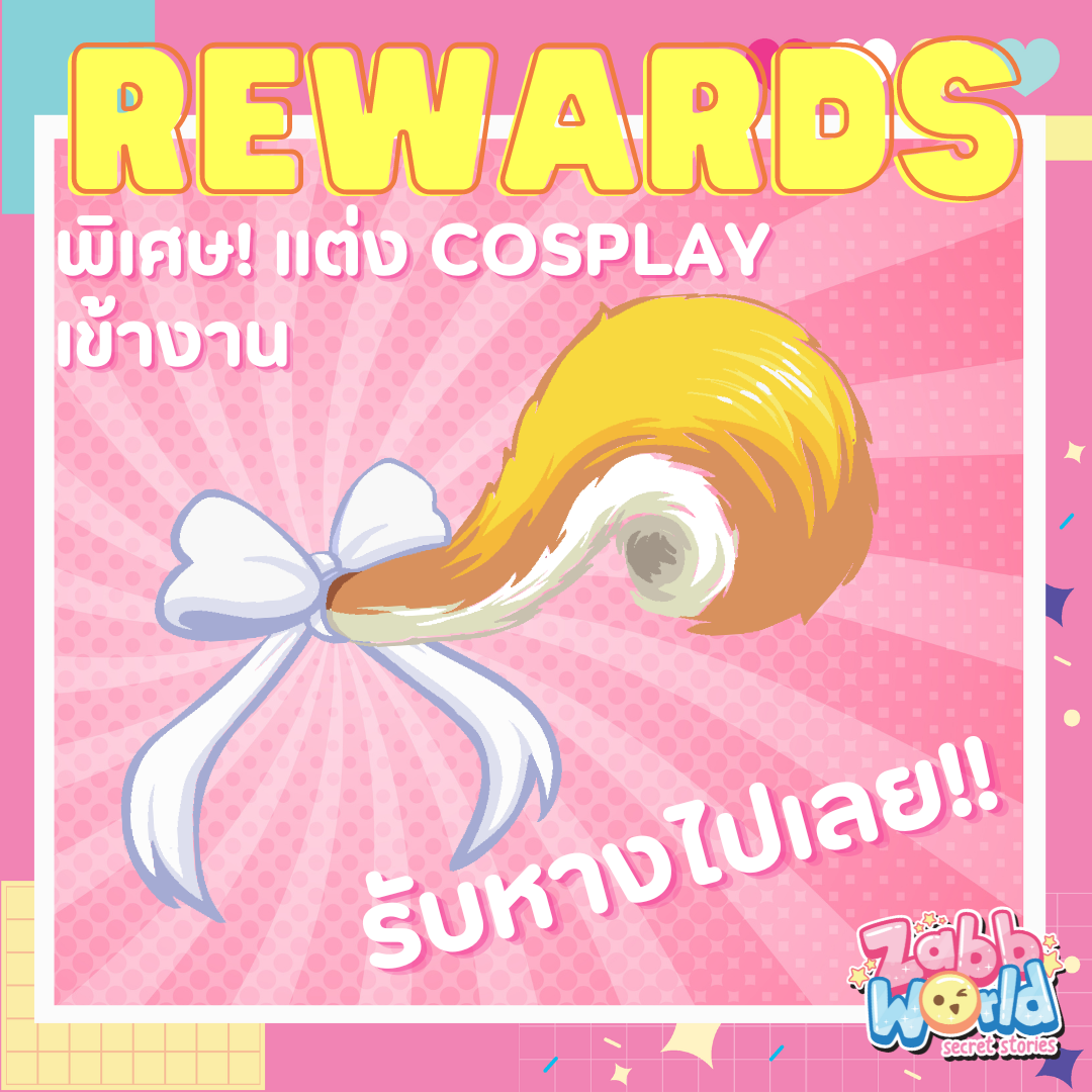 สายคอสเพลย์เราก็มีหากมีใจรักการแต่งตัวไม่ว่าจะเป็นการแต่งคอสเพลย์เป็นตัวละครเหล่า NPC ภายในเกม หรือแต่งตัวในไลฟ์สไตล์ตรงตามต้นฉบับของเกม Zabb World แล้วเดินทางเข้าภายในงานรับไปเลย ไอเทมเครื่องประดับในสล็อต "หาง" ครั้งแรกที่ยังไม่มีจำหน่ายภายในเกม! (ของรางวัลมีจำนวนจำกัด)